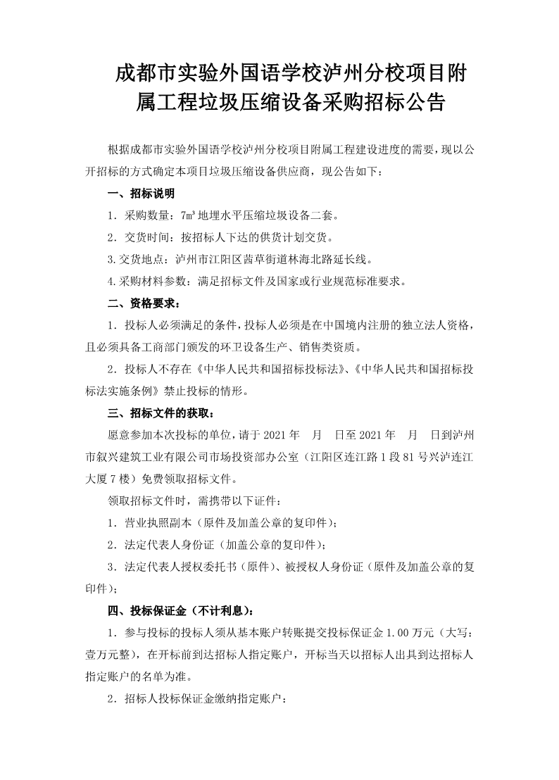 成都市實(shí)驗(yàn)外國語學(xué)校瀘州分校項(xiàng)目附屬工程垃圾壓縮設(shè)備采購招標(biāo)公告 作者: 來源: 日期:2021-12-10 瀏覽次數(shù): 次 【字體:小 大】 【打印正文】