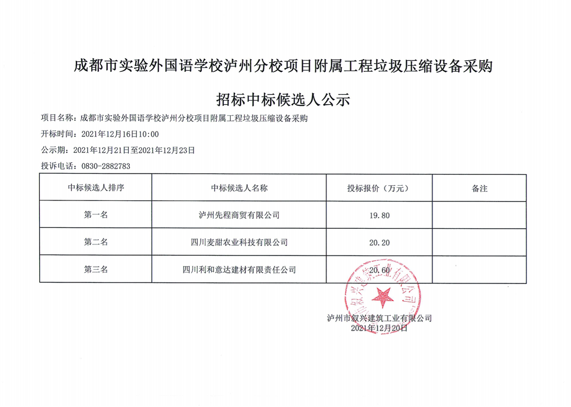 成都市實(shí)驗(yàn)外國語學(xué)校瀘州分校項(xiàng)目附屬工程垃圾壓縮設(shè)備采購招標(biāo)中標(biāo)候選人公示 作者: 來源: 日期:2021-12-20 瀏覽次數(shù): 次 【字體:小 大】 【打印正文】