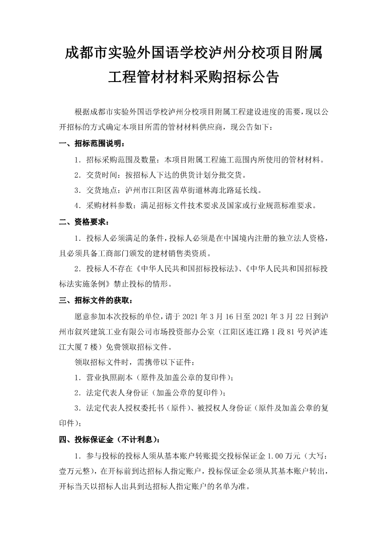 成都市實(shí)驗(yàn)外國語學(xué)校瀘州分校項(xiàng)目附屬工程管材材料采購招標(biāo)公告 作者: 來源: 日期:2021-03-15 瀏覽次數(shù): 次 【字體:小 大】 【打印正文】