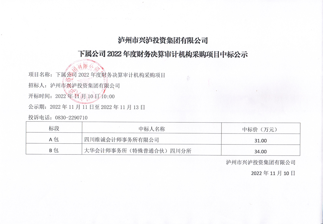 瀘州市興瀘投資集團有限公司下屬公司2022年度財務決算審計機構采購項目中標公示