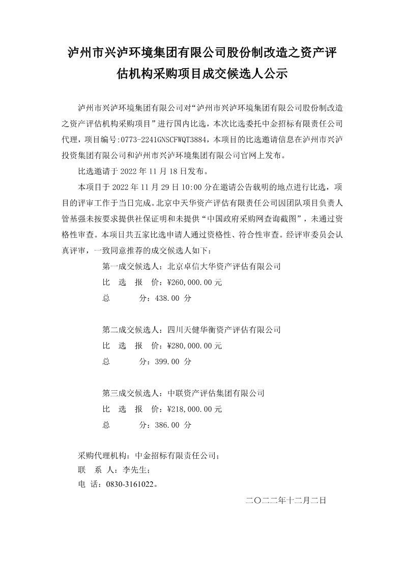 瀘州市興瀘環(huán)境集團(tuán)有限公司股份制改造之資產(chǎn)評(píng)估機(jī)構(gòu)采購(gòu)項(xiàng)目成交候選人公示 作者: 來(lái)源: 日期:2022-12-02 瀏覽次數(shù): 次 【字體:小 大】 【打印正文】