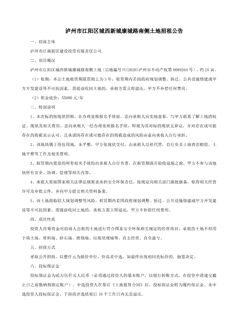 瀘州市江陽區(qū)城西新城康城路南側土地招租公告