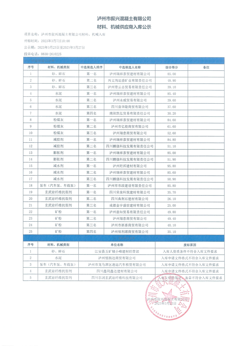 瀘州市敘興混凝土有限公司材料、機械供應(yīng)商入庫公示