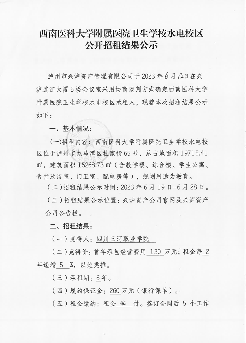 西南醫(yī)科大學(xué)附屬醫(yī)院衛(wèi)生學(xué)校水電校區(qū)公開招租結(jié)果公示 作者: 來源: 日期:2023-06-21 瀏覽次數(shù): 次 【字體:小 大】 【打印正文】