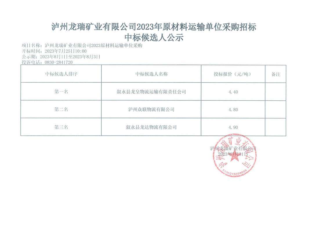 瀘州龍瑞礦業(yè)有限公司2023年原材料運輸單位采購招標中標候選人公示