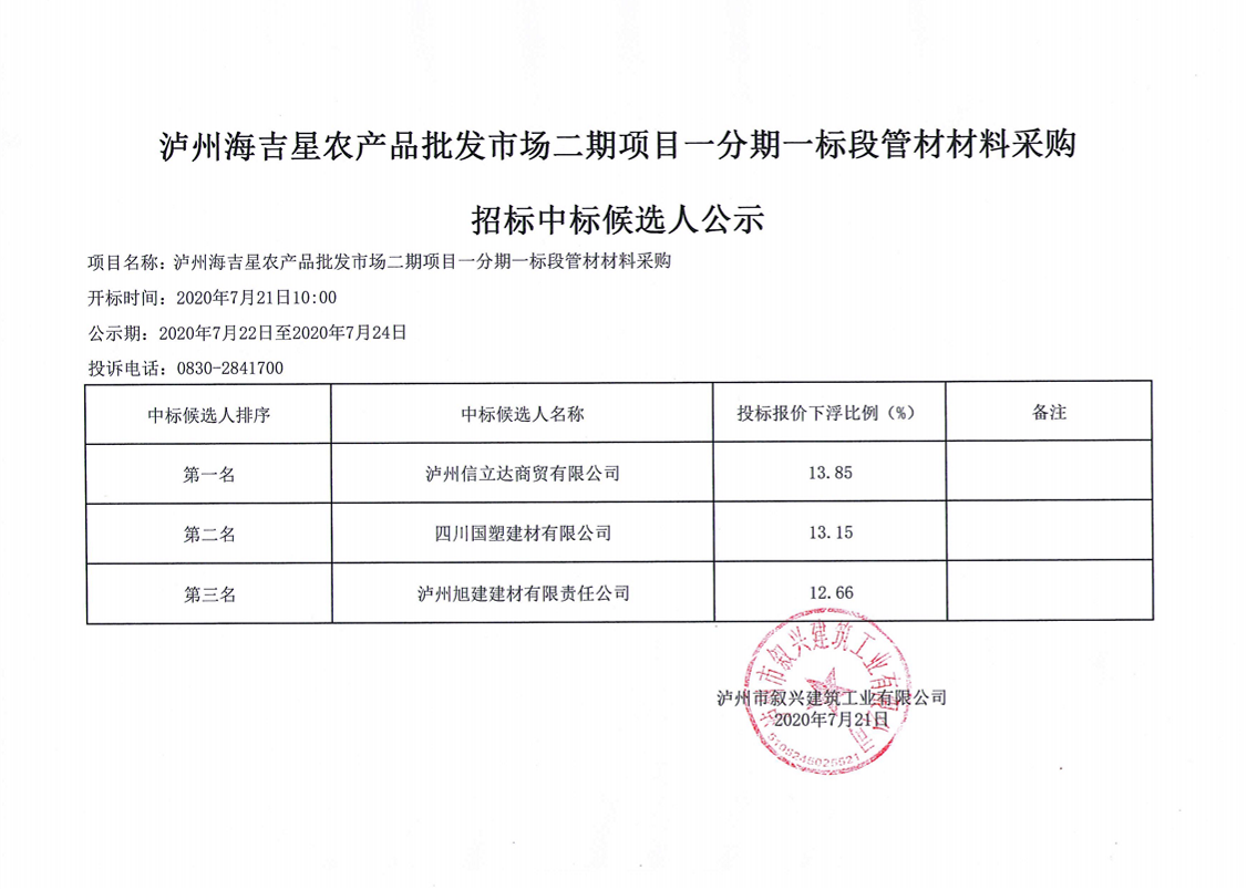 瀘州海吉星農(nóng)產(chǎn)品批發(fā)市場二期項目一分期一標(biāo)段管材材料采購招標(biāo)中標(biāo)候選人公示 作者: 來源: 日期:2020-07-21 瀏覽次數(shù): 次 【字體:小 大】 【打印正文】