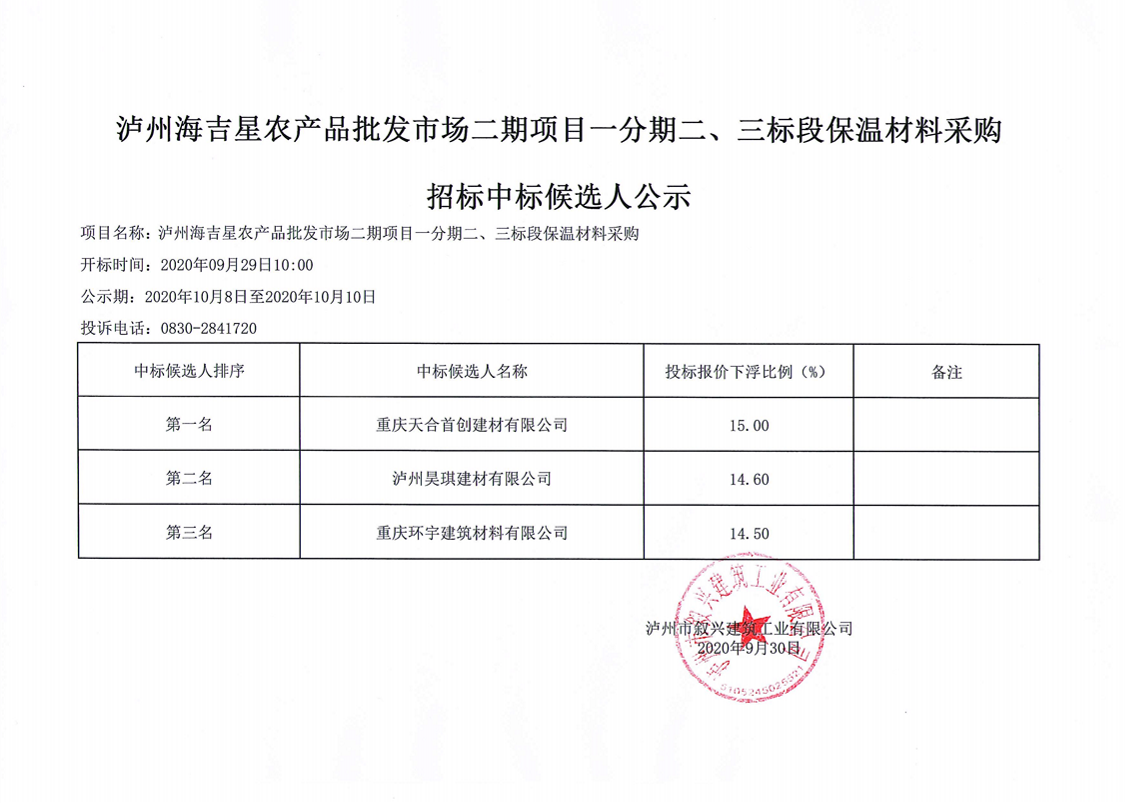 瀘州海吉星農(nóng)產(chǎn)品批發(fā)市場二期項目一分期二三標(biāo)段保溫材料采購招標(biāo)中標(biāo)候選人公示 作者: 來源: 日期:2020-09-30 瀏覽次數(shù): 次 【字體:小 大】 【打印正文】