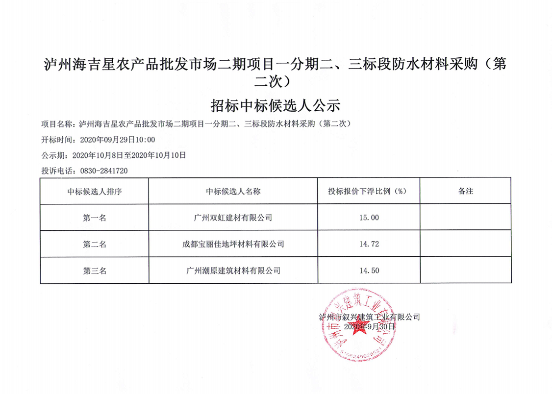 瀘州海吉星農(nóng)產(chǎn)品批發(fā)市場二期項目一分期二三標(biāo)段防水材料采購招標(biāo)(第二次)中標(biāo)候選人公示 作者: 來源: 日期:2020-09-30 瀏覽次數(shù): 次 【字體:小 大】 【打印正文】