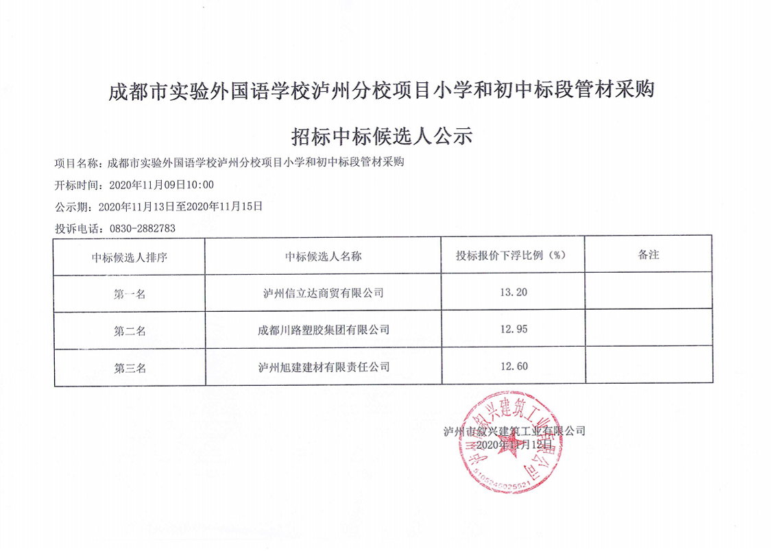 成都市實驗外國語學(xué)校瀘州分校項目小學(xué)和初中標(biāo)段管材采購招標(biāo)中標(biāo)候選人公示 作者: 來源: 日期:2020-11-12 瀏覽次數(shù): 次 【字體:小 大】 【打印正文】