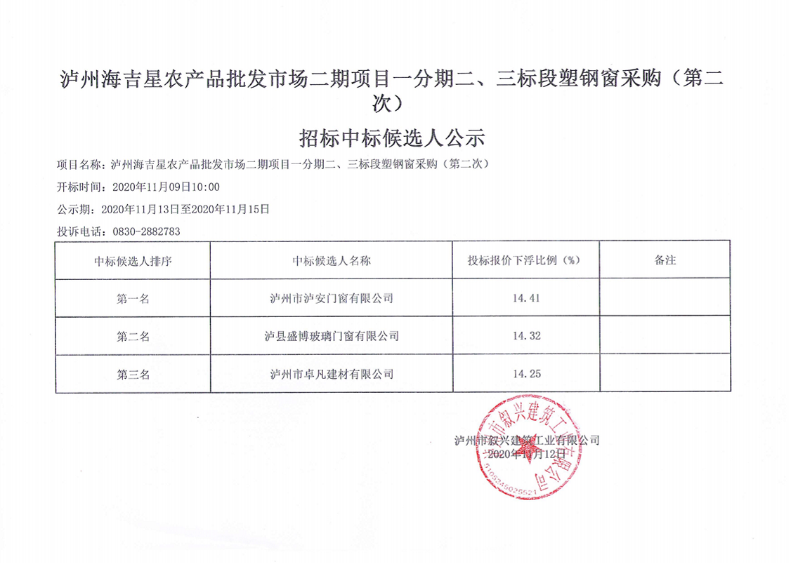 瀘州海吉星農(nóng)產(chǎn)品批發(fā)市場二期項目一分期二三標(biāo)段塑鋼窗采購(第二次)招標(biāo)招標(biāo)候選人公示 作者: 來源: 日期:2020-11-12 瀏覽次數(shù): 次 【字體:小 大】 【打印正文】