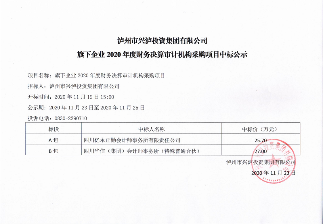 瀘州市興瀘投資集團(tuán)有限公司旗下企業(yè)2020年度財務(wù)決算審計機(jī)構(gòu)采購項目中標(biāo)公示 作者: 來源: 日期:2020-11-23 瀏覽次數(shù): 次 【字體:小 大】 【打印正文】